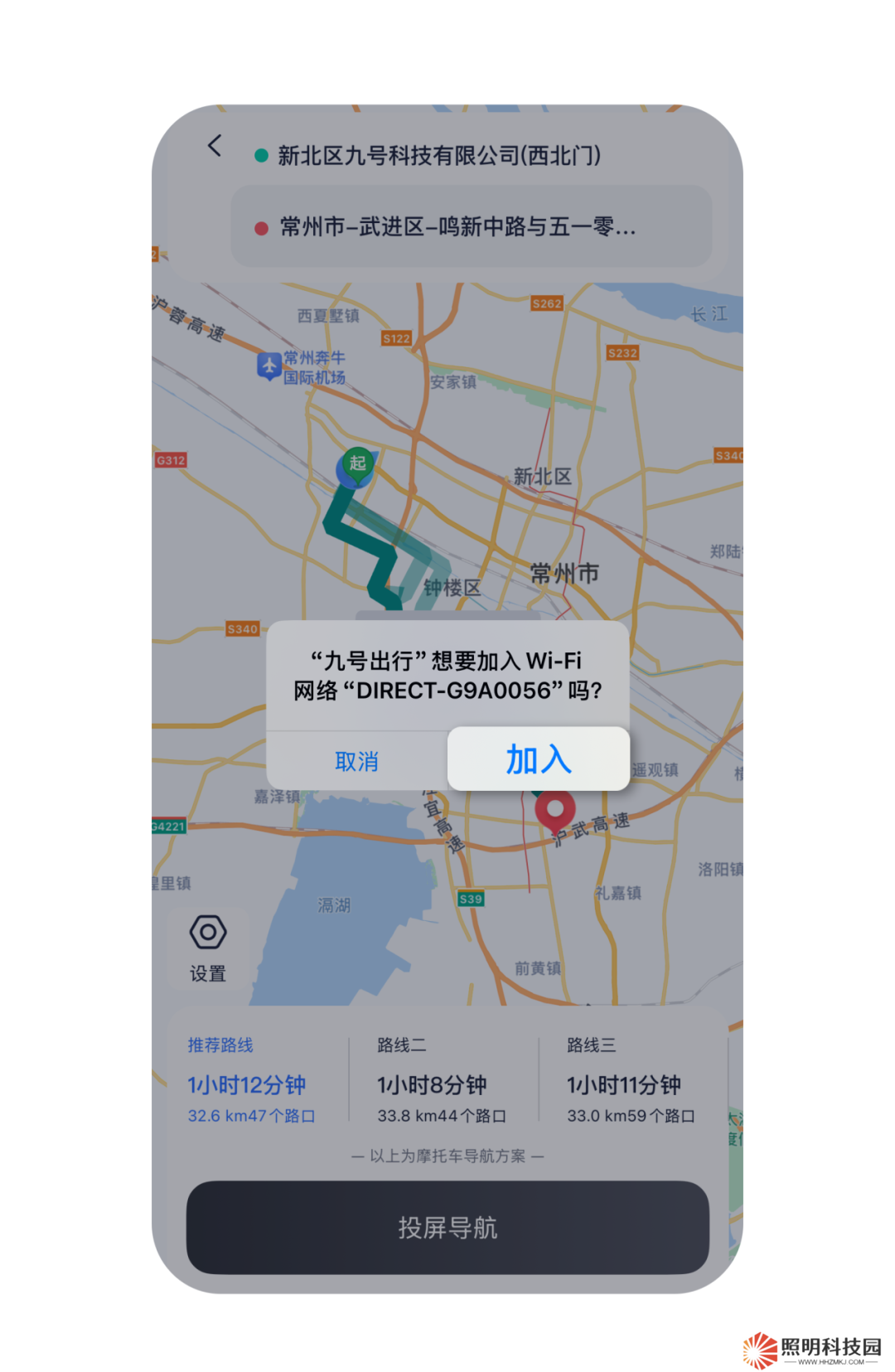 步驟四:點(diǎn)擊投屏導(dǎo)航按鈕,根據(jù)彈窗加入車輛熱點(diǎn),將行程路線一鍵投屏至電動車智能儀表