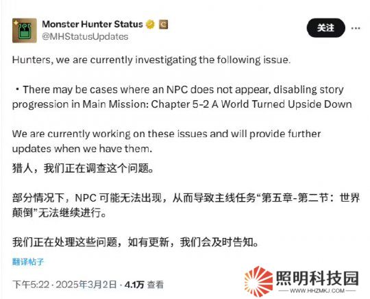卡普空在公告中表示:“獵人們,我們正在調(diào)查以下問題。部分情況下,NPC 未出現(xiàn),導(dǎo)致主線任務(wù)第五章第二節(jié)的劇情無法推進(jìn)。我們正在解決這一問題,并會在有新進(jìn)展時向大家更新?!?/p>