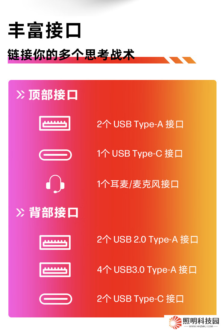 該機(jī)支持Wi-Fi 7技術(shù),機(jī)箱頂部配備2個(gè)USB-A接口、1個(gè)USB-C接口、1個(gè)3.5mm音頻接口;背面配備 4個(gè)USB-A 3.0接口、2個(gè)USB-A 2.0接口、2個(gè)USB-C接口。