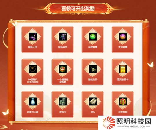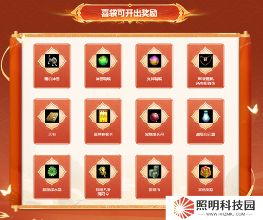 喜袋內(nèi)含豐富獎(jiǎng)勵(lì),普通版的道友有機(jī)會(huì)開(kāi)出隨機(jī)元靈(元靈從赤天、混沌、笛舞、降魔、夫諸、震魃中隨機(jī)開(kāi)出)、隨機(jī)神獸、變異、神獸精魄、變異精魄、滿屬性裝備箱、80級(jí)隨機(jī)所有相首飾、道具套餐卡、商城道具、道行,游戲幣等。