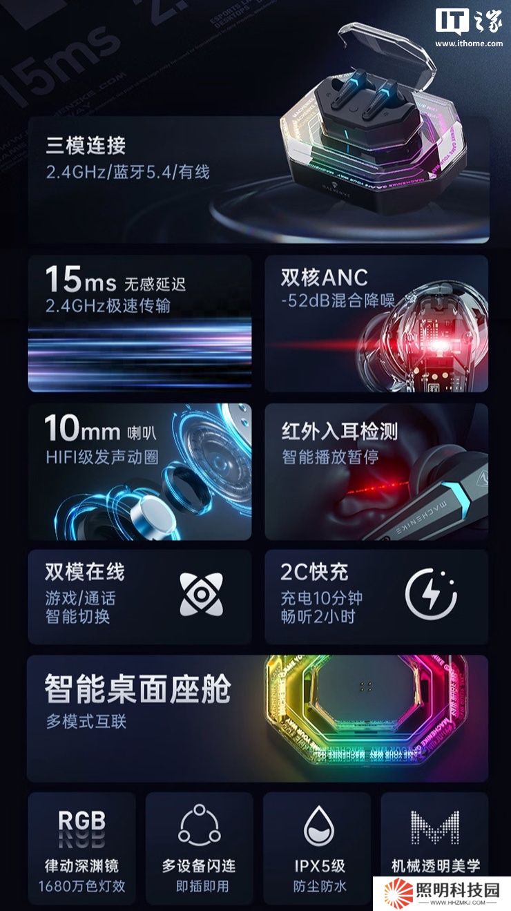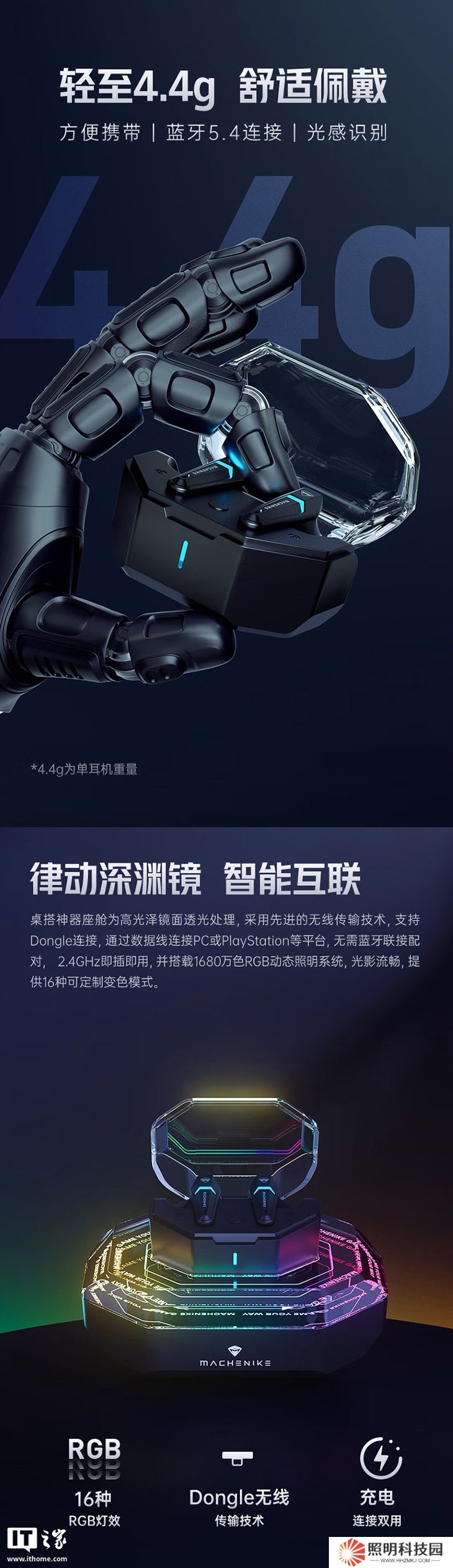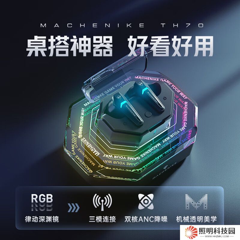 機(jī)械師三模電競耳機(jī) TH70 Pro 采用電競風(fēng)格外觀設(shè)計,充電盒為半透明材質(zhì),帶有類似千面鏡的 1600 萬色 RGB 光效。耳機(jī)本身造型棱角分明,單耳重量 4.4 克,支持入耳檢測、觸控快捷操作功能。