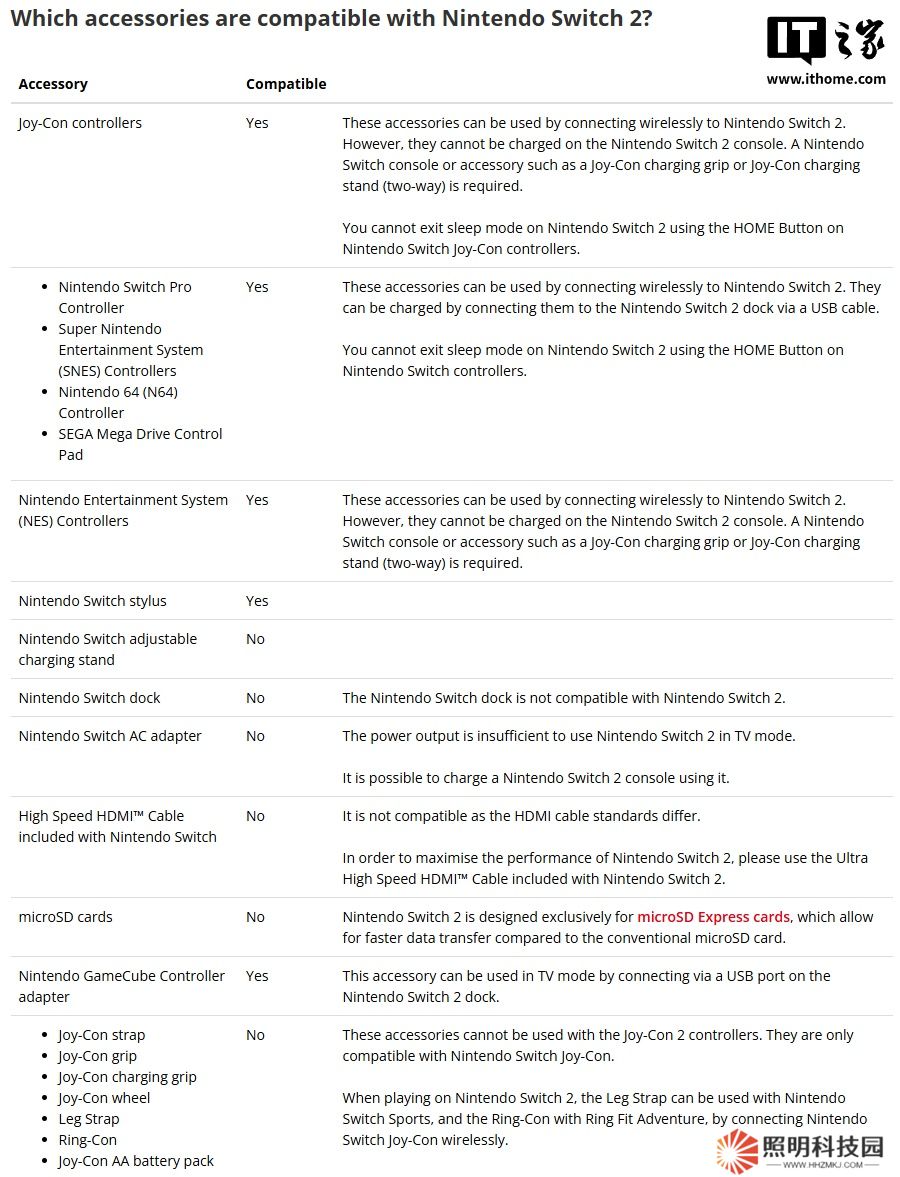 除控制器外,Nintendo Switch 觸控筆依然兼容 Switch 2,而 Nintendo Switch 充電支架、充電底座均無法使用,而原有充電器雖然能用但由于規(guī)格落后也已經(jīng)不足以支持 Switch 2 開啟 TV 模式,Switch原裝 HDMI 線和原有 microSD 存儲(chǔ)卡也不再兼容Switch 2。