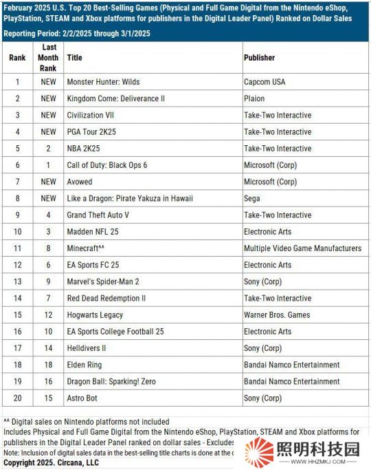 根據(jù)統(tǒng)計機構(gòu)NPD發(fā)布的數(shù)據(jù),除了《怪物獵人:荒野》外,2月發(fā)售的其他兩個新作——《天國:拯救》(2.4)和《文明7》(2.11)也都上榜,分列第二和第三名。黑曜石新作《宣誓》排名第七。