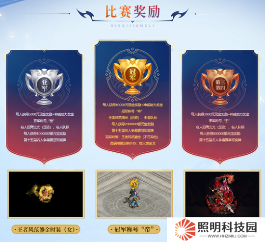 官方為本屆名人爭霸賽豪擲千萬元寶,打造了極為豐厚的獎池。普通賽區(qū)冠軍戰(zhàn)隊每人獲得10000元現(xiàn)金獎勵+神威助力獎金,經(jīng)典賽區(qū)冠軍戰(zhàn)隊每人獲得8000元現(xiàn)金獎勵+神威助力獎金,另外兩大賽區(qū)冠軍戰(zhàn)隊還將獲得冠軍稱號“帝”、王者風范流光(足跡)、王者隊標、每人獲得2000000銀元寶獎勵、第十五屆名人爭霸賽冠軍獎牌、冠軍時裝:王者風范鎏金(不可染色)、高端限量定制手辦:烽火燃金戈。行走中洲時,盡顯榮耀本色。