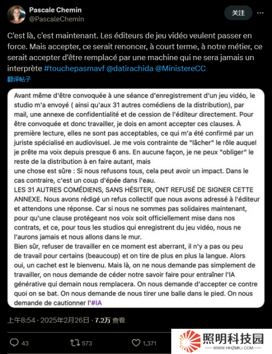 據(jù)翻譯,她在帖子中寫道:“公司給我(以及團(tuán)隊(duì)的其他 31 名配音演員)發(fā)了一封電子郵件,其中包含發(fā)行商直接提供的保密和協(xié)議。我需要接受這些條款才能開始工作。當(dāng)我躍度這些條款時(shí)我就已經(jīng)知道,并且一位專業(yè)視聽行業(yè)的法律專家證實(shí):這些條款是不可接受的?!?/p>