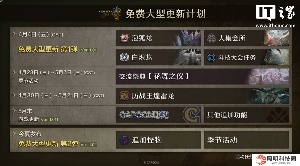 本站 4 月 3 日消息,《怪物獵人:荒野》第一彈免費大型更新(1.010.00.00)將于明日 11:00 正式上線,卡普空剛剛在官網(wǎng)發(fā)布了此次更新說明。本站翻譯如下: