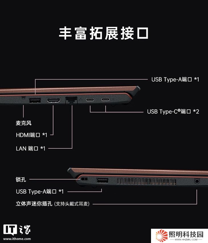 I/O方面,該機(jī)左側(cè)配備1個(gè) USB-A 接口、1個(gè) 3.5mm 音頻接口;右側(cè)配別1個(gè) USB-A接口、1個(gè) HDMI接口、1個(gè) RJ45網(wǎng)口、2個(gè) USB-C接口。