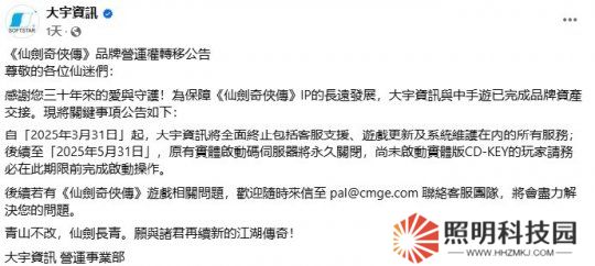 今日,大宇資訊發(fā)布《仙劍奇?zhèn)b傳》品牌營(yíng)運(yùn)權(quán)轉(zhuǎn)移公告:自2025年3月31日起,將全面終止對(duì)《仙劍奇?zhèn)b傳》系列游戲的客服支持、游戲更新及系統(tǒng)維護(hù)等所有服務(wù)。此外,游戲?qū)嶓w版激活碼服務(wù)器將在2025年5月31日永久關(guān)閉。