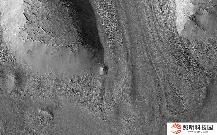 冰川狀地貌 —— 在兩個山脊間,大量物質(zhì)似乎曾向下流動,形成冰川狀地貌(Glacier-like features),這暗示火星中緯度地區(qū)過去可能存在冰層堆積。圖片來源:美國國家航空航天局 /噴氣推進實驗室-加州理工 / 亞利桑那大學(xué)