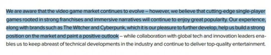 而根據(jù)CDPR公司最近的財(cái)報(bào),這家曾打造了《巫師》系列和《賽博朋克2077》的波蘭游戲開(kāi)發(fā)商表示,他們不會(huì)停止制作單人游戲,因?yàn)橥婕覍?duì)這類(lèi)游戲的需求永遠(yuǎn)不會(huì)消失,而且單人游戲依舊很受歡迎。
