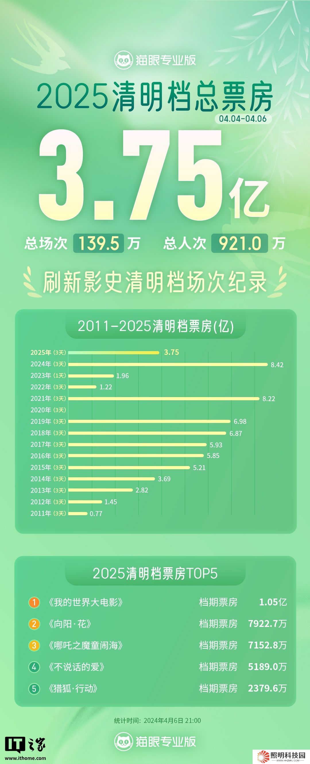 本站 4 月 6 日消息,據(jù)貓眼專業(yè)版數(shù)據(jù),2025 年 4 月 6 日 17 時(shí) 20 分,2025 年清明檔新片總票房破 3 億,《我的世界大電影》暫列第一,《向陽?花》和《不說話的愛》分列二三位。