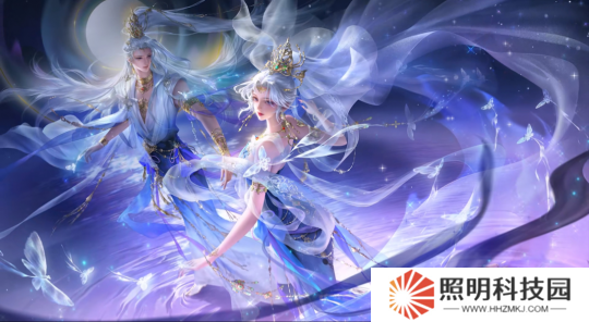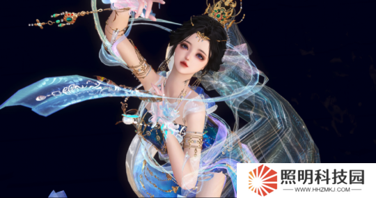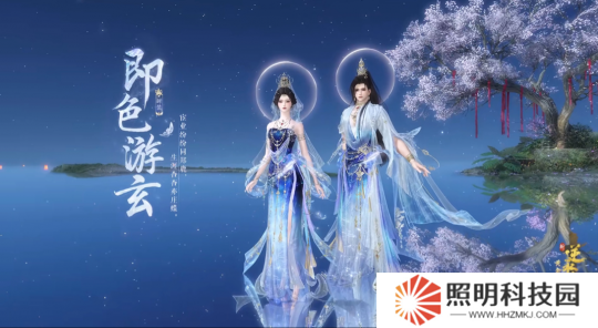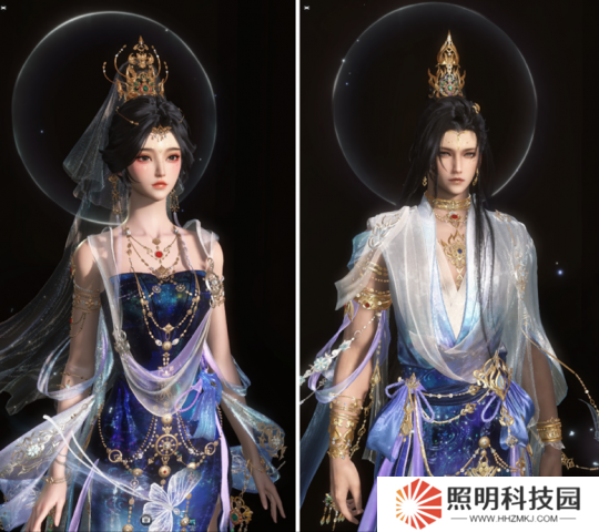 女款【即色游玄】似乎是將九天銀河化作衣裙,從深邃藍色漸變到淺白色的設計頗為別致,背后的皎潔玉盤、隨風搖曳的薄紗,以及華麗精致的飾品組合在一起,將神圣感打滿了全屏,以至于玩家發(fā)出了“自此不敢見觀音”的感嘆。
