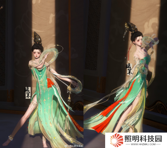再來看這位玩家,直接在神女時裝的基礎上,爆改了一版極具異域風情的“敦煌風配色”。紅、黃、綠三色的經典混搭、飄逸唯美的紗質設計,結合上展露出的優(yōu)美線條,這不就是從壁畫中走出來的飛天仙女嘛!