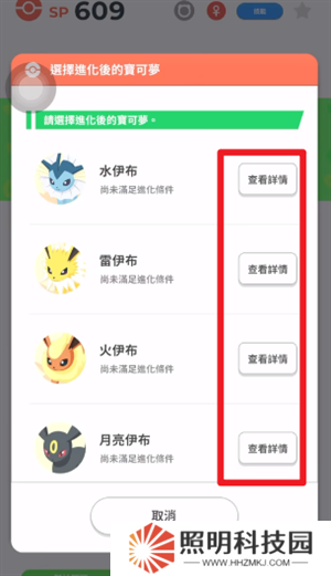 3、點(diǎn)擊對(duì)應(yīng)的進(jìn)化形態(tài)右側(cè)的查看詳情,你將能夠看到進(jìn)化的條件。