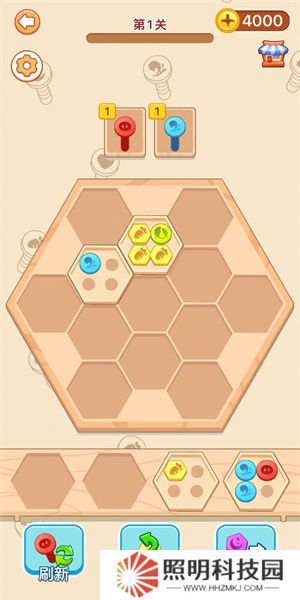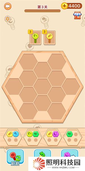 3、玩家們開始游玩之后,就需要將下方的六邊形方塊放置到上方的區(qū)域之中,每一個方塊里面會存在著數(shù)量不等的螺絲。