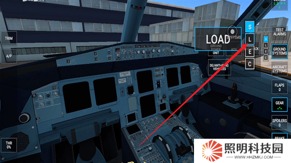 4、進入到飛行器的第一人稱模式當(dāng)中,這里面存在著各種按鍵,每一種都會具有自己的功能,右側(cè)第一個是警報系統(tǒng),第二個是地面系統(tǒng),第三個是貨物,第四個是油量。