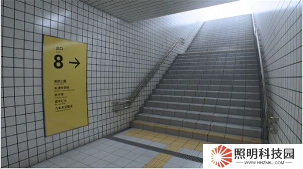 上方是排列整齊的白燈,有黃色的8號出口標識,標識后寫著“地下廣場”;