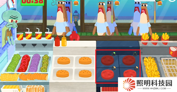 3、當出現(xiàn)客人之后,就能夠開始煎肉餅,并由此進行美味蟹皇堡的制作了。