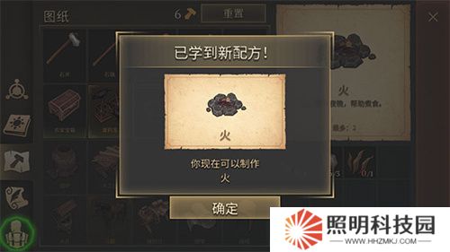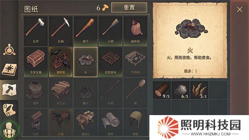 2、收集足夠的材料,并在圖紙菜單中按照配方制作火堆。