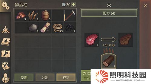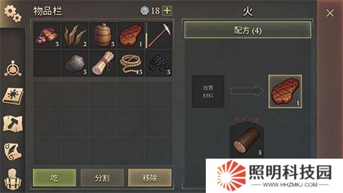 6、在火堆的操作界面中,添加生肉和木料作為燃料,然后等待烹飪過程完成,即可獲得美味的烤肉。