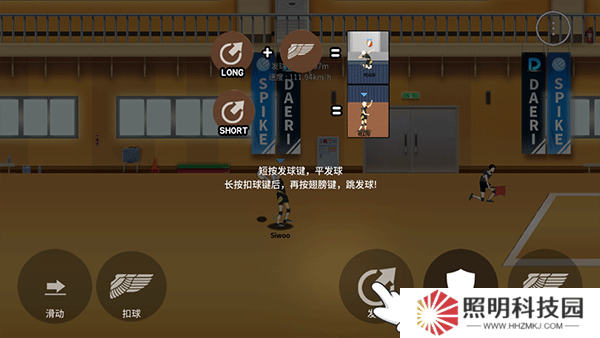 5、玩家可以根據(jù)站位進(jìn)行選擇發(fā)球,長按發(fā)球鍵是平發(fā)球,長按扣球鍵再按翅膀鍵則是跳發(fā)球。