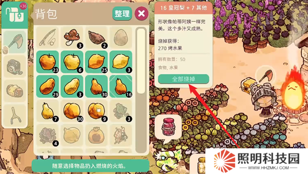 2、收集完果實之后,前往篝火的位置,將水果全部燒掉,然后你就會獲得烤水果。