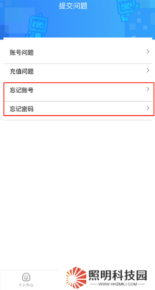 3、根據(jù)自己的情況選擇“忘記賬號(hào)”或者“忘記密碼”的選項(xiàng)來進(jìn)行申請(qǐng)。