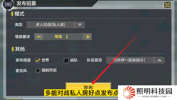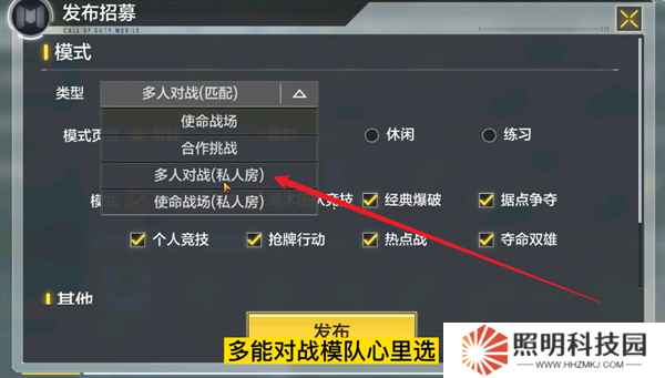 4、就會彈出一個發(fā)布招募的模式選擇界面,這個時候只要在模式類型里面選擇【多人對戰(zhàn)(私人房)】就行。