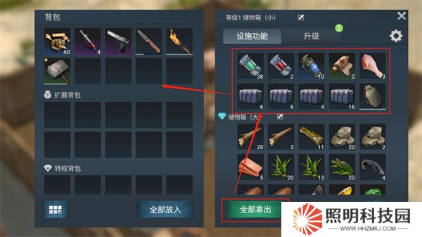 1、進(jìn)入原有箱子,點(diǎn)擊全部拿出,快速將箱子物品取至背包。