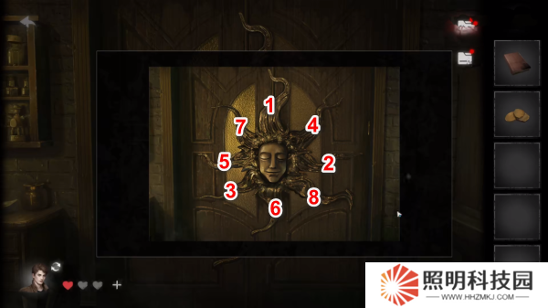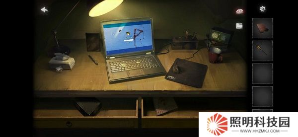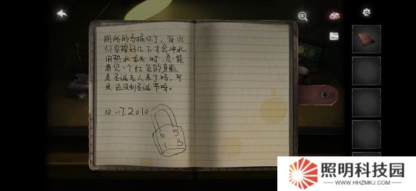 1、冰箱暗門進(jìn)入后是書房,來到書桌前,看到相冊(cè)(正方形圖案)、左抽屜的保險(xiǎn)箱和右抽屜的日記(線索1:密碼鎖)。