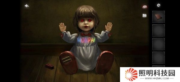 8、出來到走廊,把電池裝在娃娃上,獲得線索2(MONPAI)