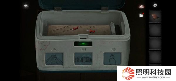 16、來到書柜前,右下有個(gè)藍(lán)色蓋子的箱子。根據(jù)三個(gè)圖形對(duì)應(yīng)的圖片打開,得到圖釘。