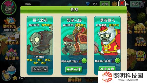 進(jìn)入一個(gè)模式后可以看見(jiàn)有三個(gè)模式選擇,簡(jiǎn)單模式僵尸1階,困難模式僵尸2階,傳奇模式僵尸3階,大家可以根據(jù)自己植物的階數(shù)和想獲得的獎(jiǎng)勵(lì)來(lái)選擇。