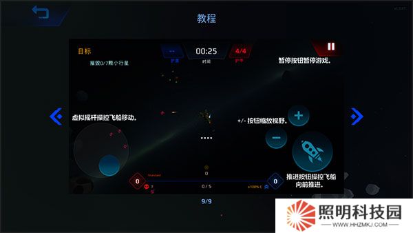 6、手機(jī)的操作方式如下圖所示,虛擬搖桿操控飛船進(jìn)行移動,右下角的推進(jìn)按鈕操控飛船向前推進(jìn)。