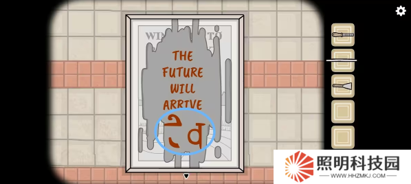 6、接著用刮刀劃開墻上的海報(bào)獲得符號(羅斯胸口懷表的提示)。