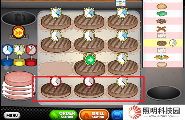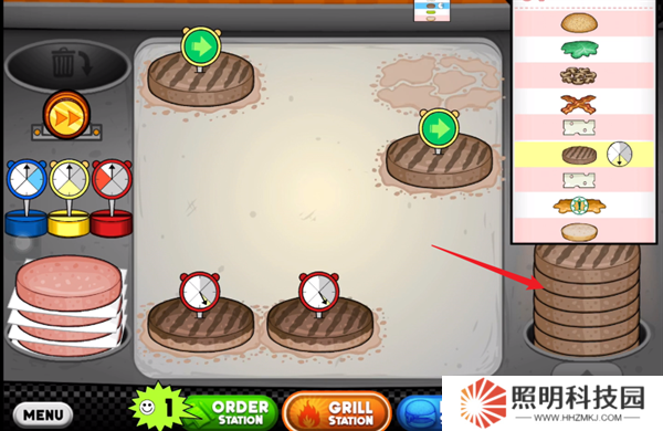 1、玩家們首先需要將自己后廚當(dāng)中的生肉餅放到烤盤上。