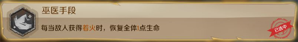 專屬卡牌“焚荒”能提供一個穩(wěn)定的全體著火buff,配合初始天賦“巫醫(yī)手段”可以在前期擁有較強(qiáng)的恢復(fù)能力。