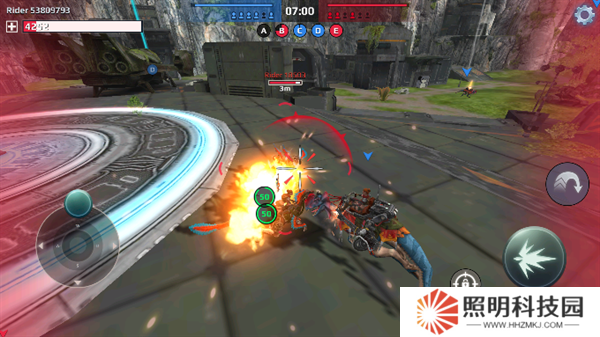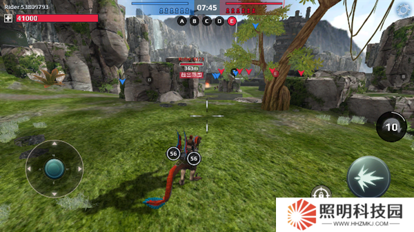 3、進(jìn)入到場景內(nèi)后滑動(dòng)左下角輪盤控制恐龍移動(dòng),點(diǎn)擊右下角按鍵既可以控制恐龍進(jìn)行攻擊。