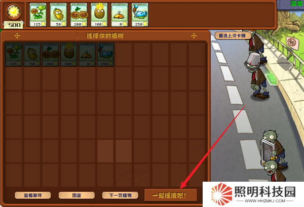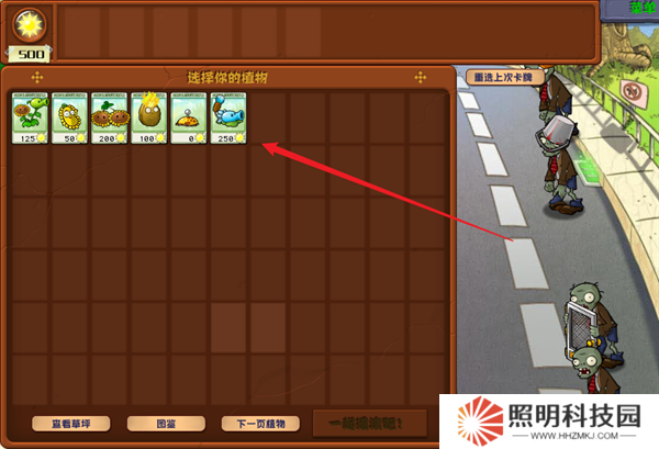 6、你可以在右側(cè)看到這一個關(guān)卡內(nèi)部需要進(jìn)行作戰(zhàn)的僵尸,并從左邊選擇自己出戰(zhàn)的植物卡牌。
