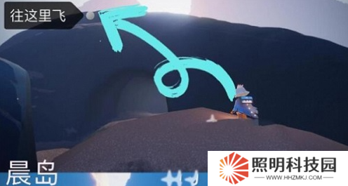 1、玩家們在進入晨島地圖之后往前方的山上飛,越過山之后在石洞上方的左手邊能夠找到第一個小金人。