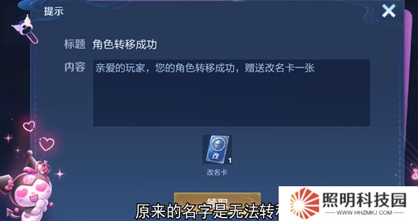 11、因為角色的名字是無法轉移的,所以轉區(qū)成功之后還會在郵箱發(fā)放一張改名卡,你可以對自己的名稱進行修改。
