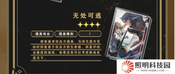 使裝備者攻擊力提高,當消滅敵方目標時回復基于攻擊力的生命值,四星中攻擊最高的加咸,如果沒有可以考慮換成四星光錐【在藍天下】。