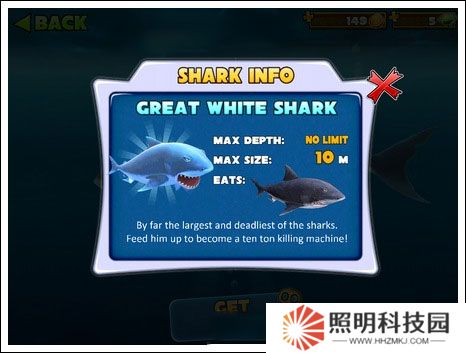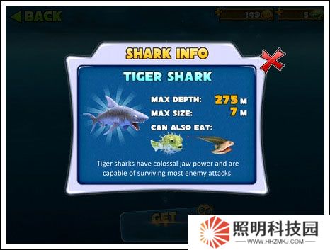 這條鯊魚的速度和下潛深度有所提高,能多吃兩種魚類,但需要25顆鉆石,性價比不高。