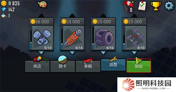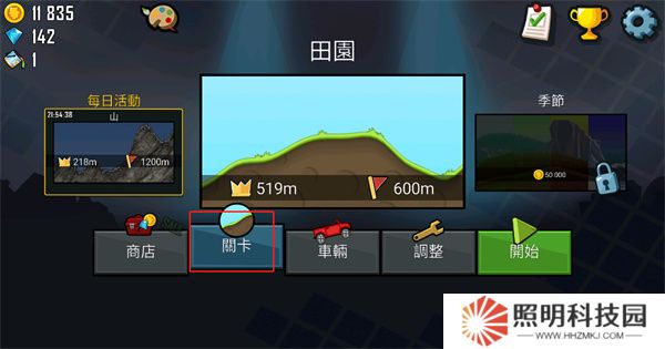1、首先在本站中下載打開(kāi)登山賽車手游,點(diǎn)擊主界面的關(guān)卡選項(xiàng)。