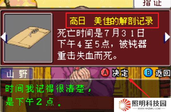 9、完成初步的詢問(wèn)之后就會(huì)出現(xiàn)證人,此時(shí)你需要通過(guò)證物來(lái)指正對(duì)方的漏洞,死亡時(shí)間選擇【高日美佳的解剖記錄】進(jìn)行反駁。