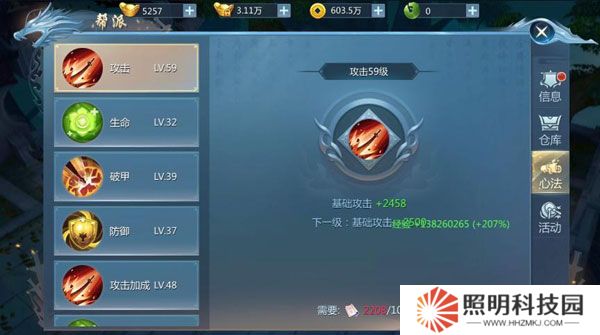3、在幫派界面里面你還可以修行心法,從而提升自己角色的屬性。