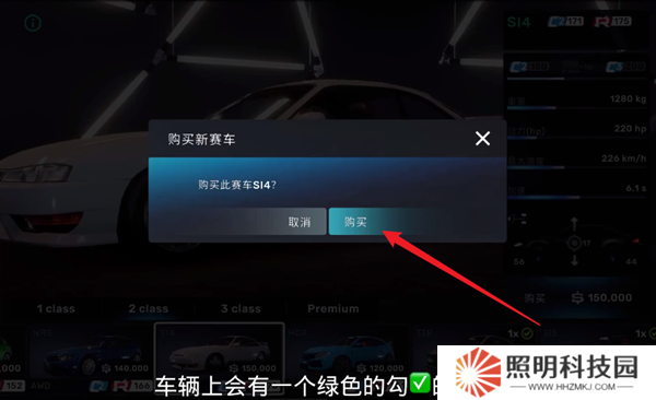 4、接著會(huì)出現(xiàn)一個(gè)彈窗,點(diǎn)擊購買就能夠完成購買的操作,列表當(dāng)中的車輛也會(huì)出現(xiàn)綠色的對(duì)勾標(biāo)志。