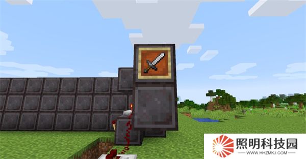 3、在展示框?qū)?yīng)的墻背面的位置擺放兩個(gè)普通方塊,在上面安放紅石比較器以及紅石粉。