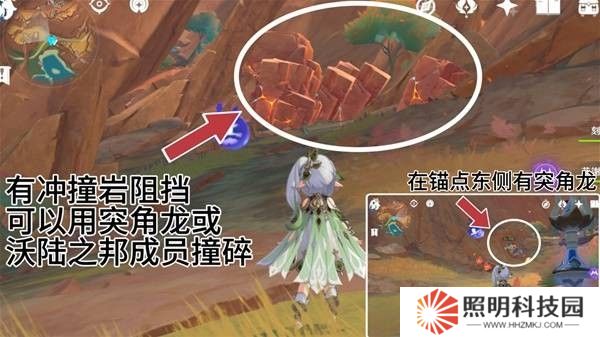 途中會(huì)遇到?jīng)_撞巖阻擋,可以使用基尼奇的技能、魂附匿葉龍,或使用瓦雷莎/伊安珊直接撞碎。清理沖撞巖后,還能獲得一個(gè)普通寶箱!