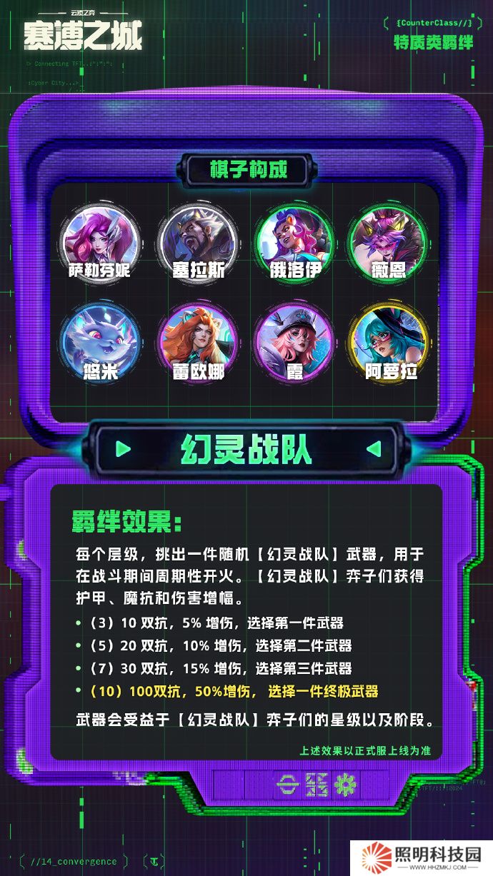 每個層級,挑出一件隨機(jī)【幻靈戰(zhàn)隊】武器,用于在戰(zhàn)斗期間周期性開火。【幻靈戰(zhàn)隊】弈子們獲得護(hù)甲、魔抗和傷害增幅。